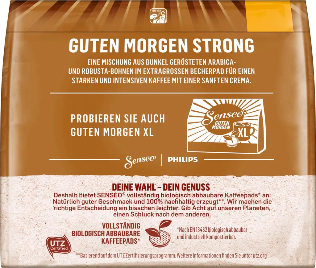 Die neue Sorte Senseo Guten Morgen XL Strong kommt im extra großen Becherpad und ist mit ihrem intensiven und starken Kaffeegeschmack der ideale Begleiter für einen perfekten Start in den Tag. Dunkel geröstete Arabica- und Robusta-Bohnen und seine sanfte Crema machen ihn zu einem ganz besonderen Genusserlebnis.