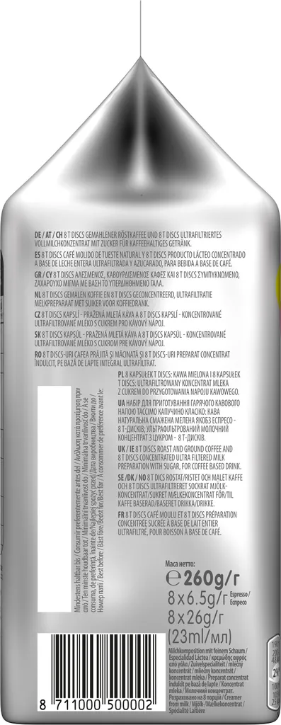 - 8 T DISCs gemahlener Röstkaffee und 8 T DISCs ultrafiltriertes Vollmilchkonzentrat mit Zucker für kaffeehaltiges Getränk.