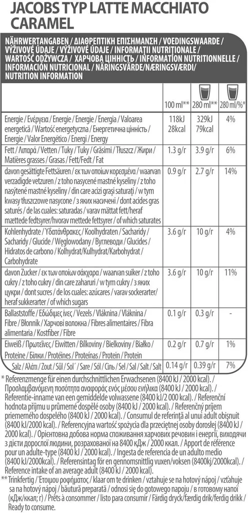 - Zutaten Latte Macchiato Caramel: Sahne (aus Milch) (30%), Zucker (28%), gemahlener Röstkaffee (21%), Wasser, Milchproteine, Milchmineralien, Salz, Verdickungsmittel (E414), Aromen, Säureregulator (E331).
