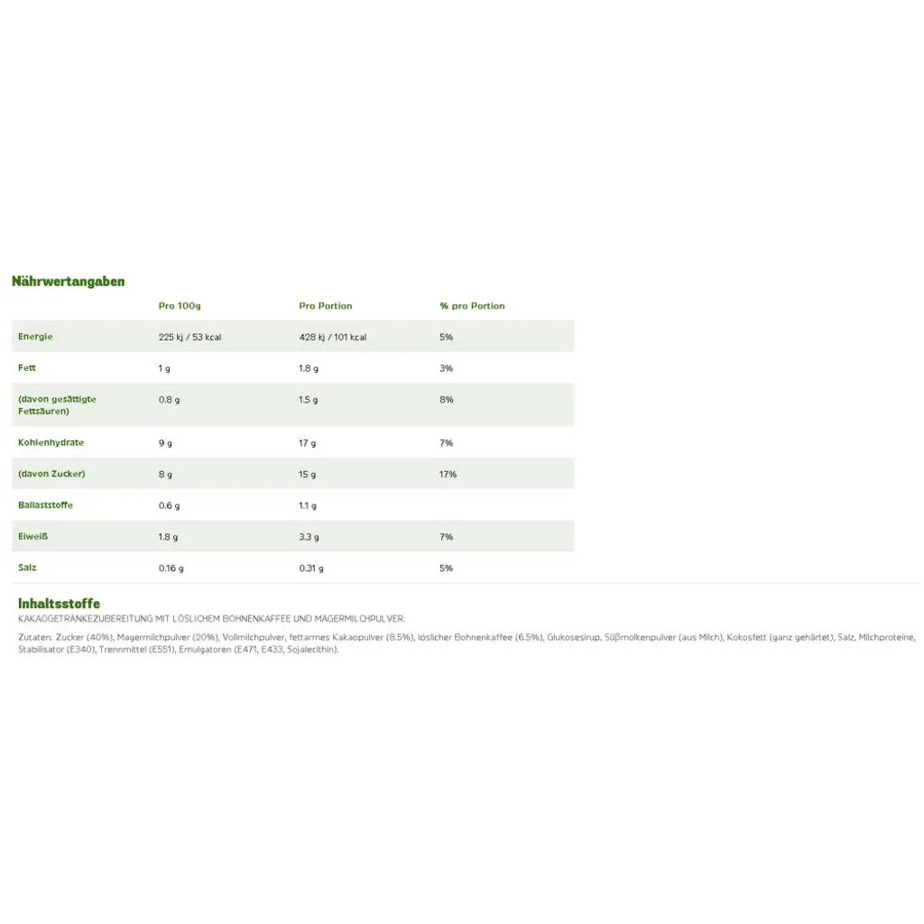 | Maxwell House Cappuccino goût choco | 100 ml | 225 kJ 53 kcal | 1,0 | 0,8 | 9,0 | 8,0 | 0,6 | 1,8 | 0,16 |