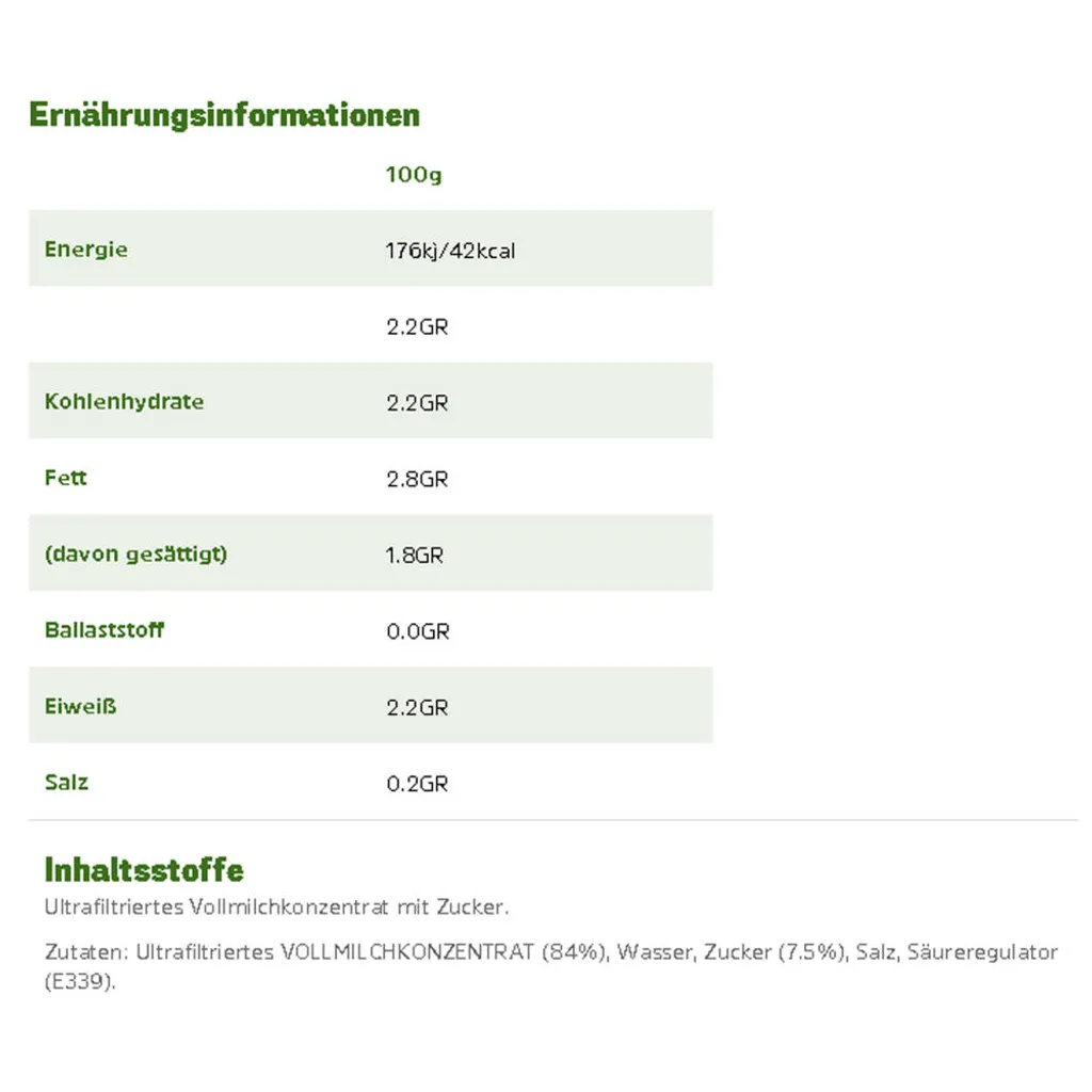 - Zutaten: Ultrafiltriertes VOLLMILCHKONZENTRAT (84%), Wasser, Zucker (7.5%), Salz, Säureregulator (E339)