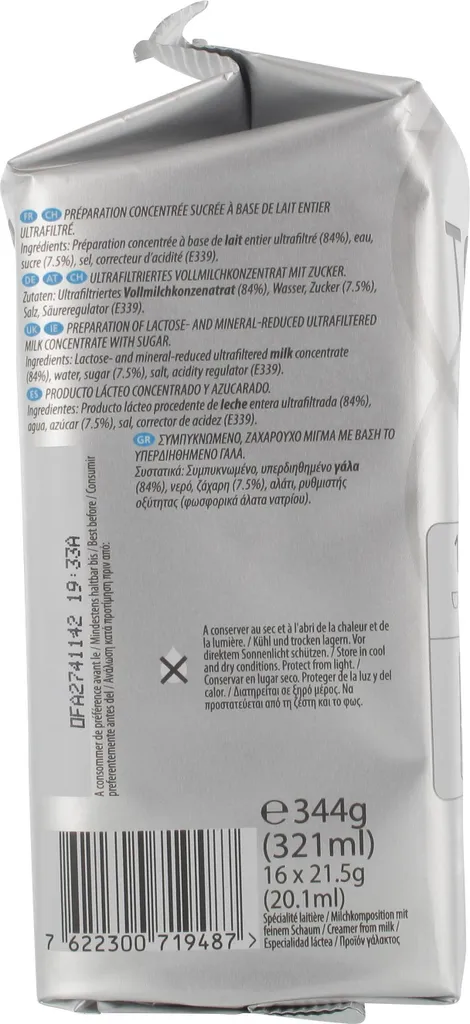 - Zutaten: Ultrafiltriertes VOLLMILCHKONZENTRAT (84%), Wasser, Zucker (7,6%), Salz, Säureregulator (E339).